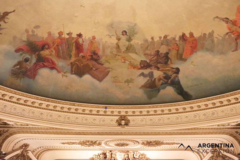 Couronnant l’édifice de ses vingt mètres de diamètre sur 3,65 mètres de hauteur, cette coupole admirée par un million de paires d’yeux chaque année est remarquablement décorée par une œuvre de Nazaremo Orlandi peinte en 1919. Au lendemain de la première guerre mondiale, elle représente une allégorie de la paix esquissée sous les traits d’une femme, située au centre de la scène, vers laquelle convergent de part et d’autre des anges et des hommes. Il est plus aisé d’avoir une vue d’ensemble de ce très beau plafond depuis le rez-de-chaussée, mais en admirer les détails nécessite de monter progressivement les étages depuis lesquels nous voyons tout aussi bien la scène en contrebas que le tableau esquissé sur la coupole. La décoration des balustrades vaut également le coup d’œil : les cariatides d’origine sculptées par l’italien Troiano Troiani sont parfaitement entretenues et tout à fait ravissantes.