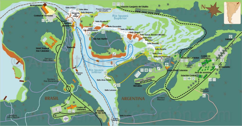 DESCRIPTIF : 80% des chutes se trouvent sur le territoire argentin, si bien que la vue du côté Brésil offre une toute autre perspective. Le parcours commence par le sentier las Cataratas (1,2 km – quelques escaliers) qui emmène jusqu’au point de vue principal, la Garganta del Diablo, accessible par une passerelle de 500 m de long. Après le déjeuner on peut visiter le parc aux Oiseaux, sanctuaire de 5 hectares habités par 800 espèces d’oiseaux, des papillons, des caïmans, des iguanes, des singes de la forêt amazonienne. Les perroquets -aras et perruches- sont les vedettes. Reste de l’après-midi libre au bord de la piscine de l’hôtel. Le véhicule reste disponible pour visiter Puerto Iguazú.