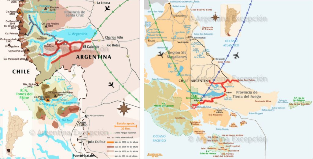DISTANCES et DURÉE : 56 km par l’ancienne piste pour se rendre à l’aéroport via El Calafate. Une heure dix de vol et 157 km soit 2 heure quinze, incluant 14 km de piste, d’Ushuaia à Rolito.